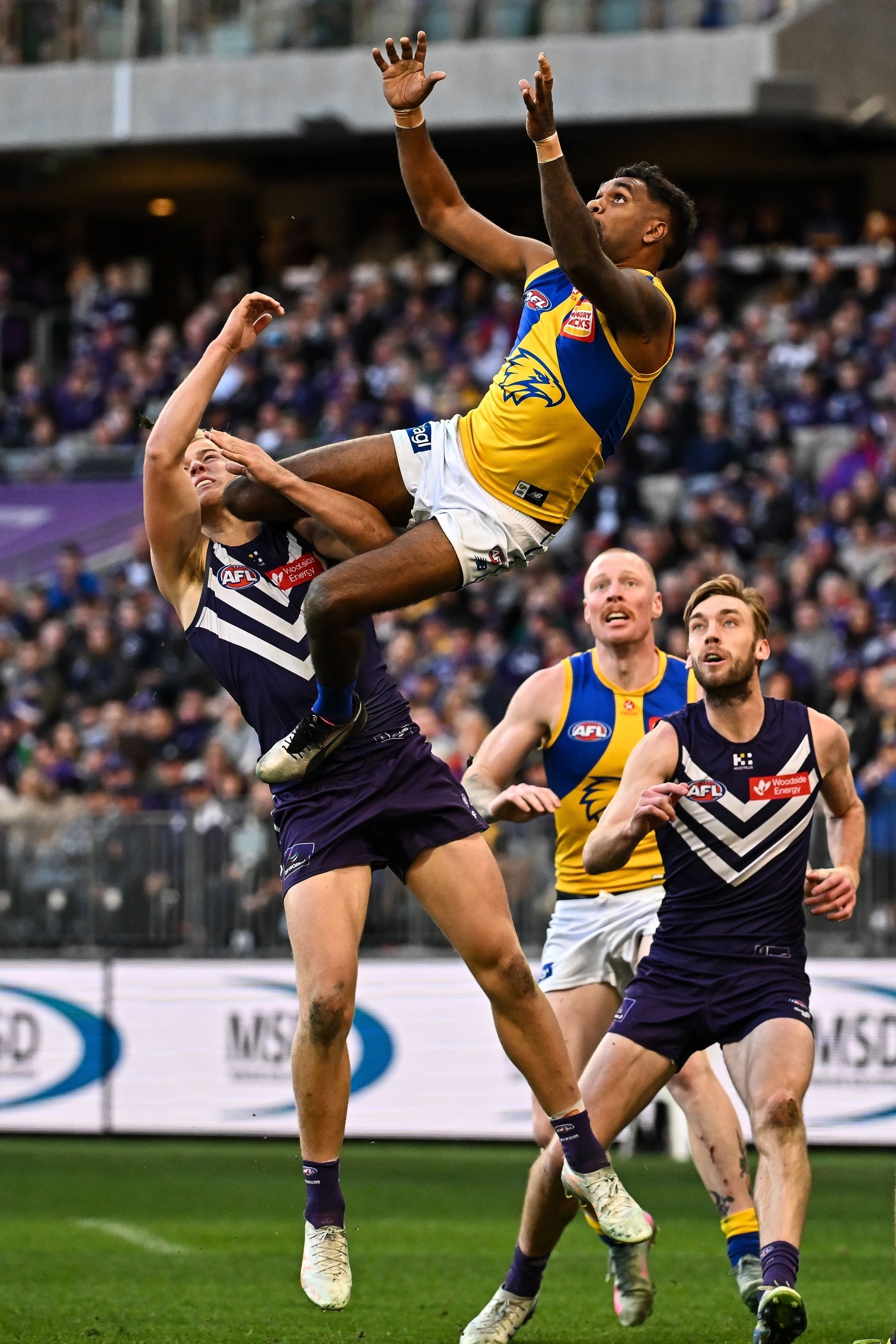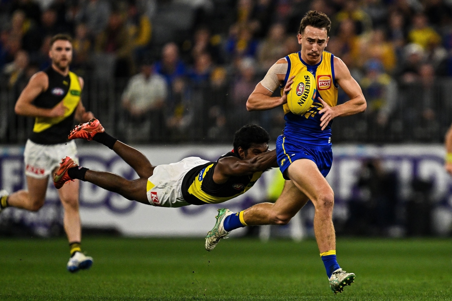 Meanwhile, Carson won the award for best photograph for his picture of Maurice Rioli jnr’s flying tackle on Brady Hough during Richmond’s clash with West Coast in round 19, 2025 at Optus Stadium.