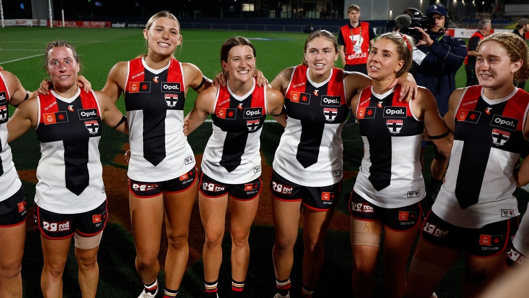 St Kilda players sing the team song after the AFLW R10 match against Carlton at Ikon Park on October 18, 2025. Picture: AFL Photos