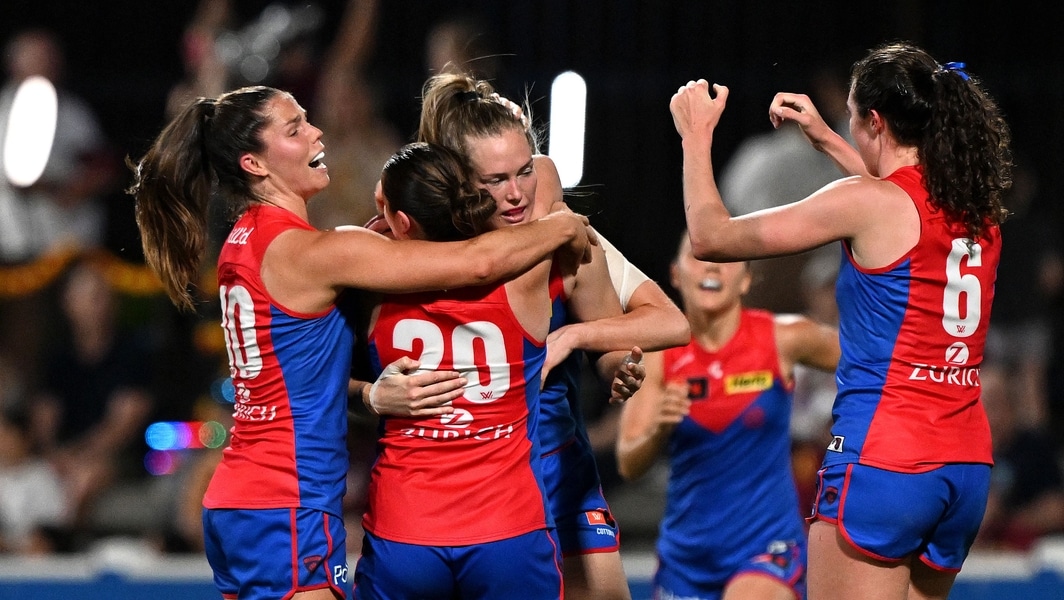 Eden Zanker celebrates with teammates after kicking a goal during the AFLW R11 match between Melbourne and Brisbane at Brighton Homes Arena on October 25, 2025. Picture: Getty Images/AFL Photos