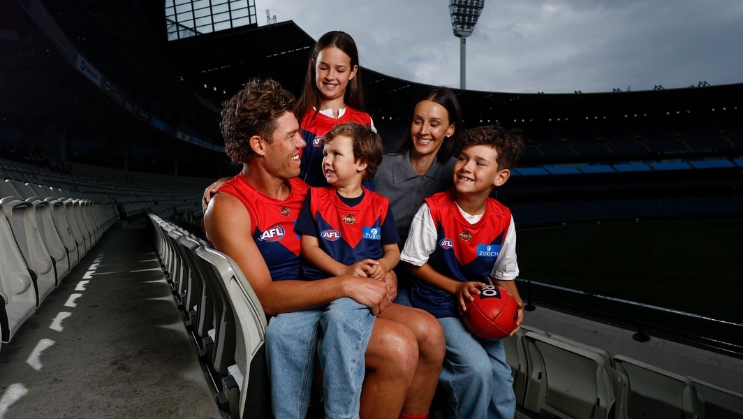 Jake Melksham with wife Stacey, daughter Frankie, sons Alfie and Teddy at the MCG, April 7, 2026. Picture: AFL Photos