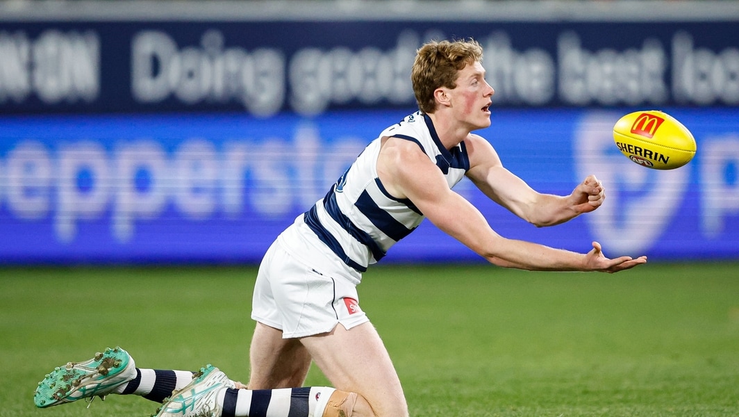 Toby Conway handballs during Geelong’s clash against Richmond in round 12, 2024. Picture: AFL Photos