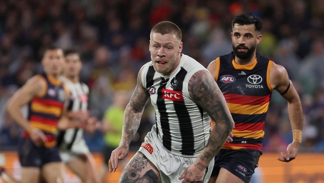 Jordan De Goey in action during Collingwood’s clash with Adelaide in round 23, 2025. Picture: AFL Photos