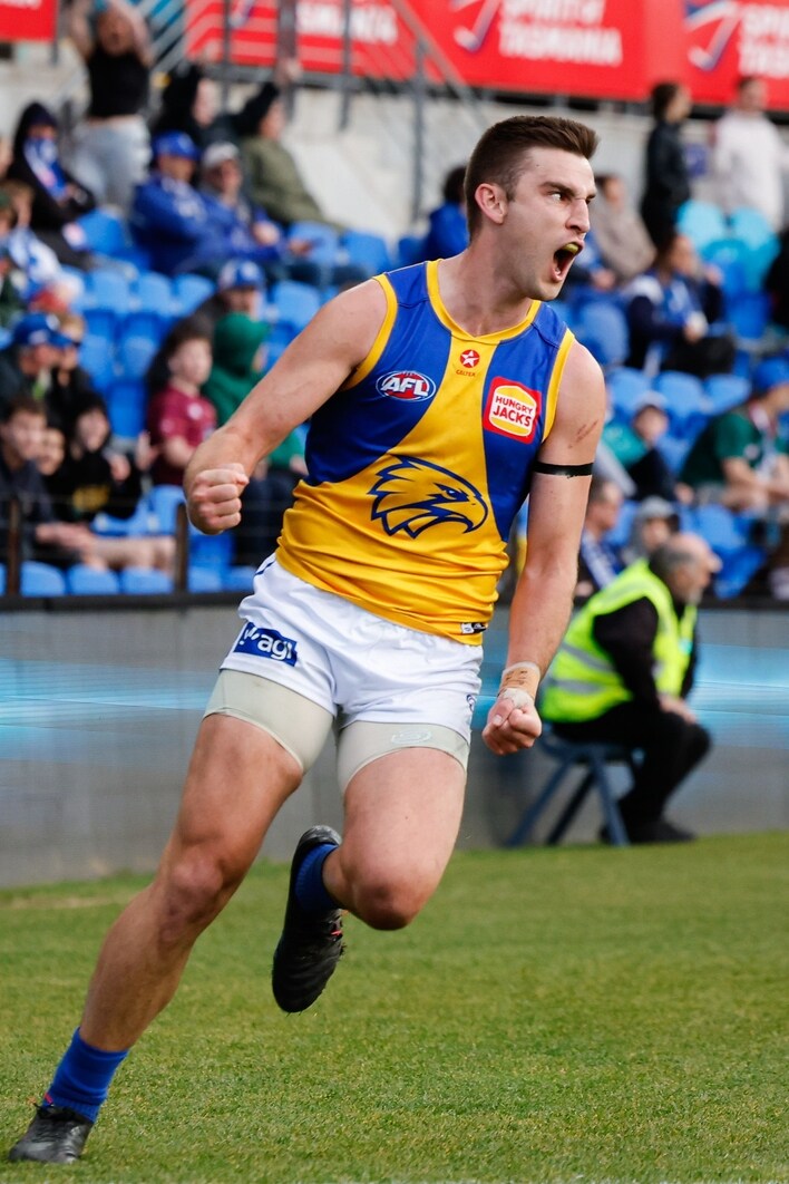 Elliot Yeo celebrates a goal during the R22 match between West Coast and North Melbourne at Ninja Stadium on August 10, 2024. Picture: AFL Photos