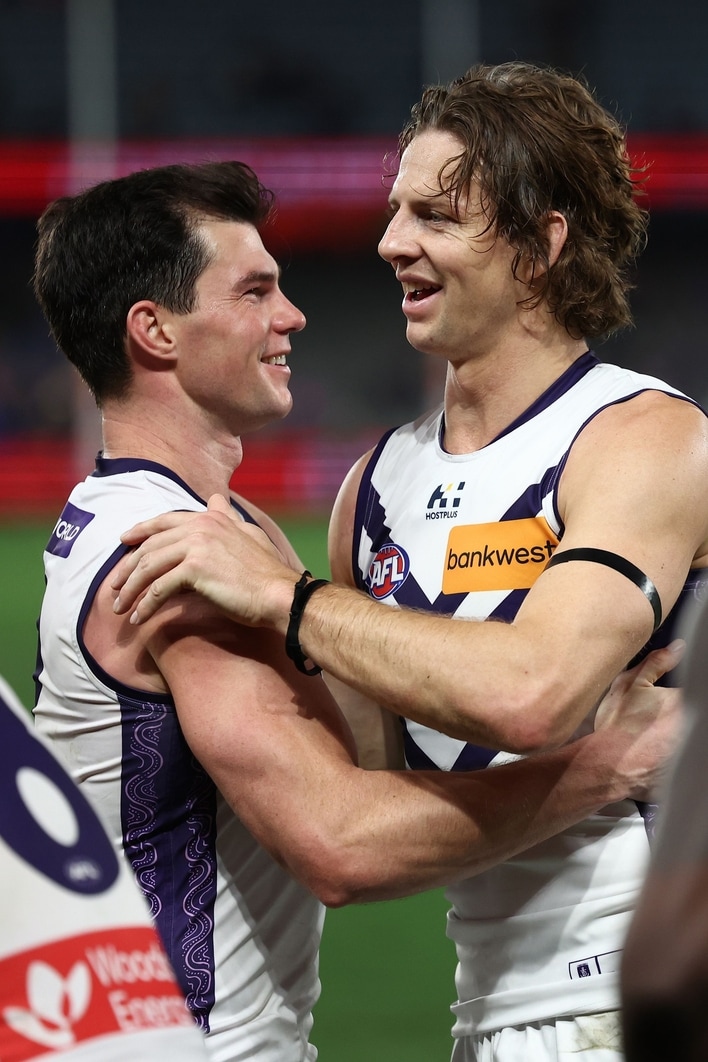 Jaeger O’Meara and Nat Fyfe celebrate after Fremantle’s win over the Western Bulldogs at Marvel Stadium in round 24, 2025. Picture: AFL Photos