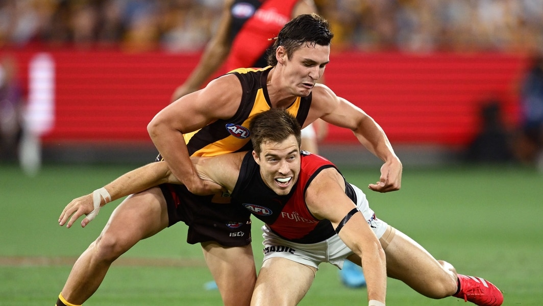 Zach Merrett and Connor Macdonald during the round one match between Hawthorn and Essendon at Melbourne Cricket Ground, on March 14, 2025. Picture: AFL Photos