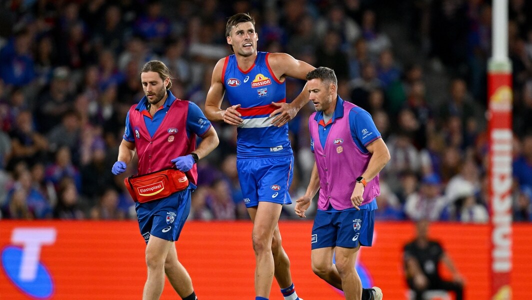 Sam Darcy leaves the ground after sustaining an injury to his knee during the match between the Western Bulldogs and St Kilda at Marvel Stadium in round six, 2025. Picture: Getty Images