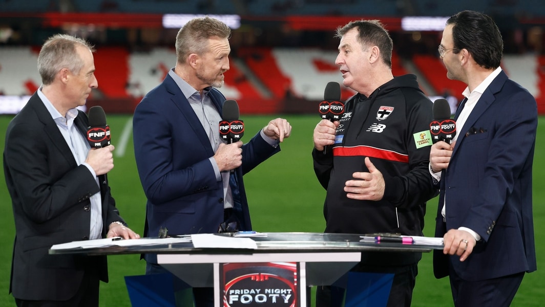 Nathan Buckley (second from left) during Fox Footy’s pre-game coverage of Essendon v St Kilda in round 23, 2025. Picture: AFL Photos