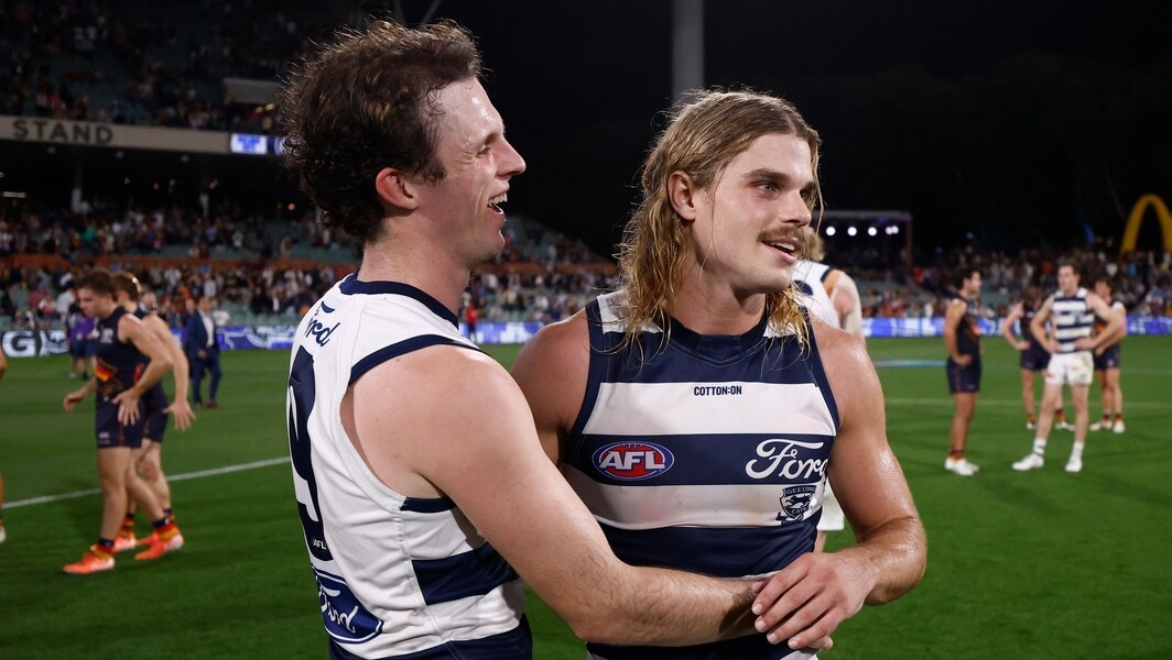 Max Holmes and Bailey Smith celebrate Geelong’s win over Adelaide in Gather Round, 2025. Picture: AFL Photos
