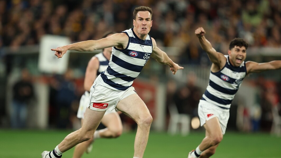 Jeremy Cameron celebrates a goal during Geelong’s preliminary final against Hawthorn on September 19, 2025. Picture: Getty Images