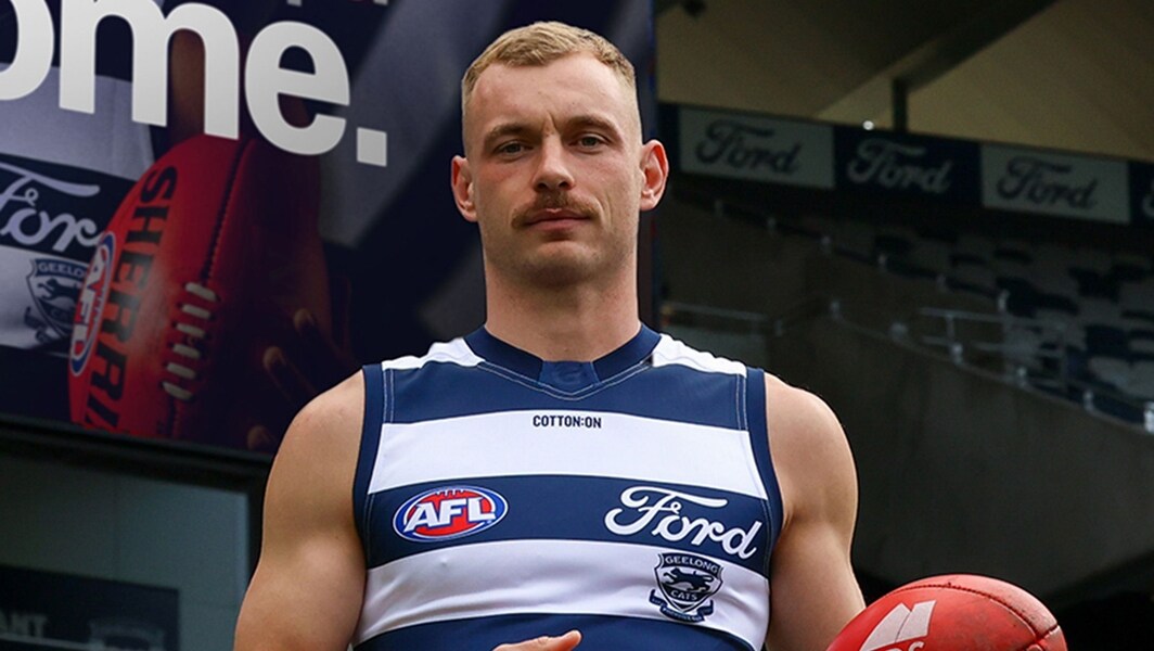 James Worpel is unveiled as a Geelong player in October, 2025. Picture: Geelong FC