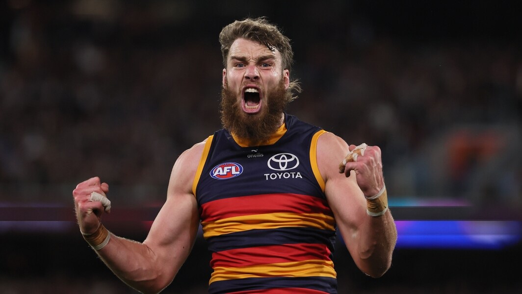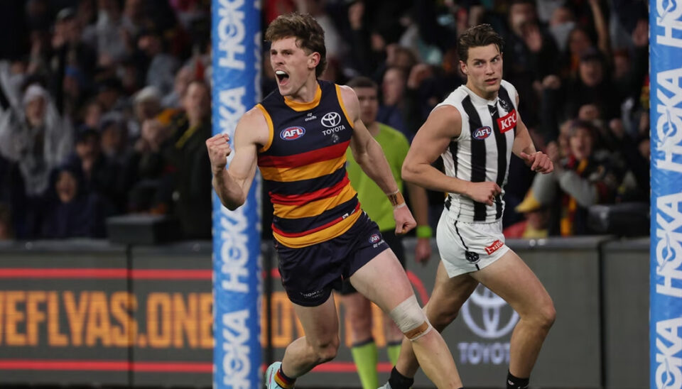 Riley Thilthorpe celebrates a goal during Adelaide’s qualifying final against Collingwood on September 4, 2025. Picture: AFL Photos