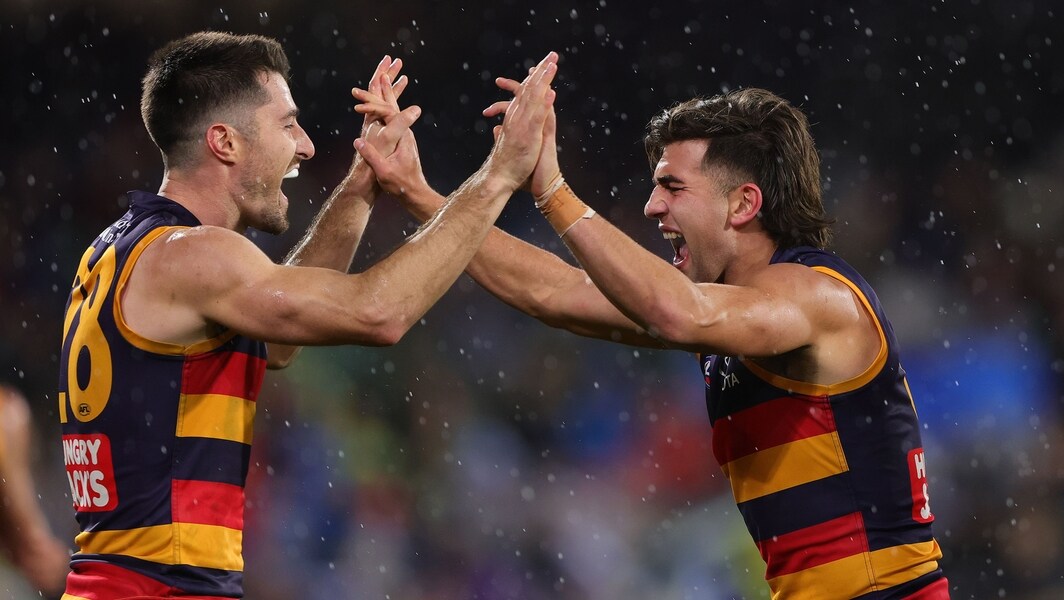 Alex Neal-Bullen and Josh Rachele celebrate a goal during Adelaide’s clash against Brisbane in round 13, 2025. Picture: AFL Photos