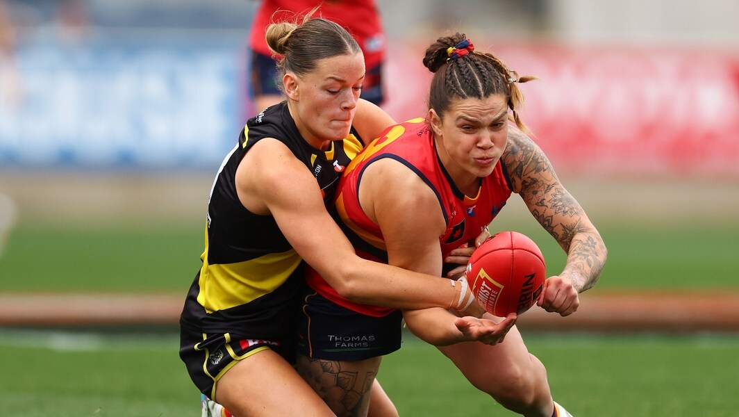 Anne Hatchard is tackled during the match between Richmond and Adelaide at Ikon Park in round eight, 2025. Picture: Getty Images
