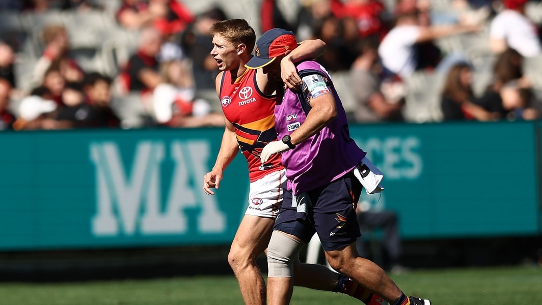 Sid Draper is helped from the ground during round two, 2025. Picture: AFL Photos/Getty Images