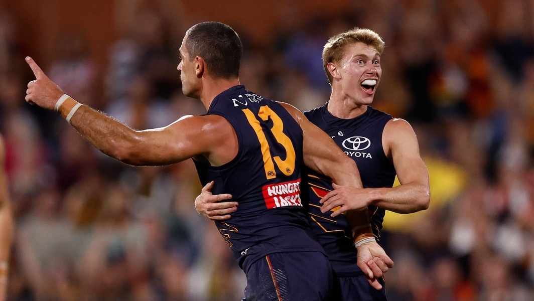 Sid Draper (right) and Taylor Walker celebrate a goal during the match between Adelaide and Geelong at Adelaide Oval in round five, 2025. Picture: AFL Photos
