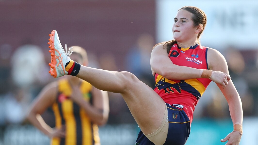 India Rasheed kicks the ball during the AFLW R5 match between Adelaide and Hawthorn at Kinetic Stadium on September 14, 2025. Picture: AFL Photos