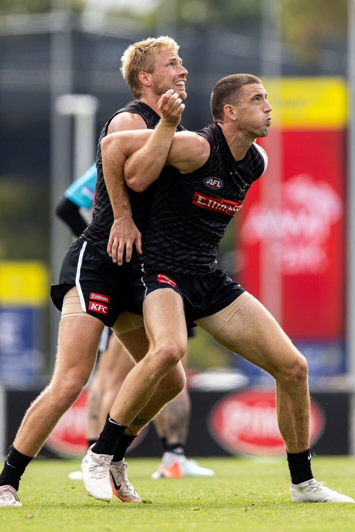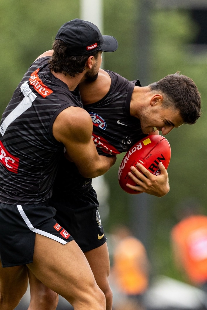 In promising signs for the Pies, injury-riddled pair Jordan De Goey and Jamie Elliott were looking secure, the former playing exclusively through the midfield for the entire session.