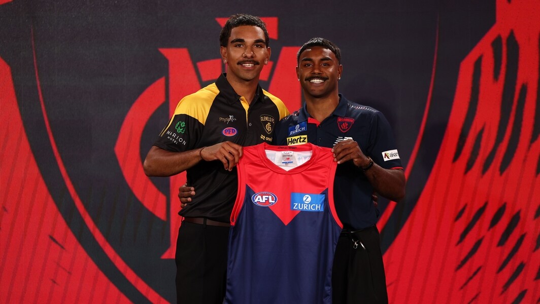 Kozzy Pickett presents cousin Latrelle with his Melbourne jumper at the 2025 Telstra AFL Draft. Picture: AFL Photos