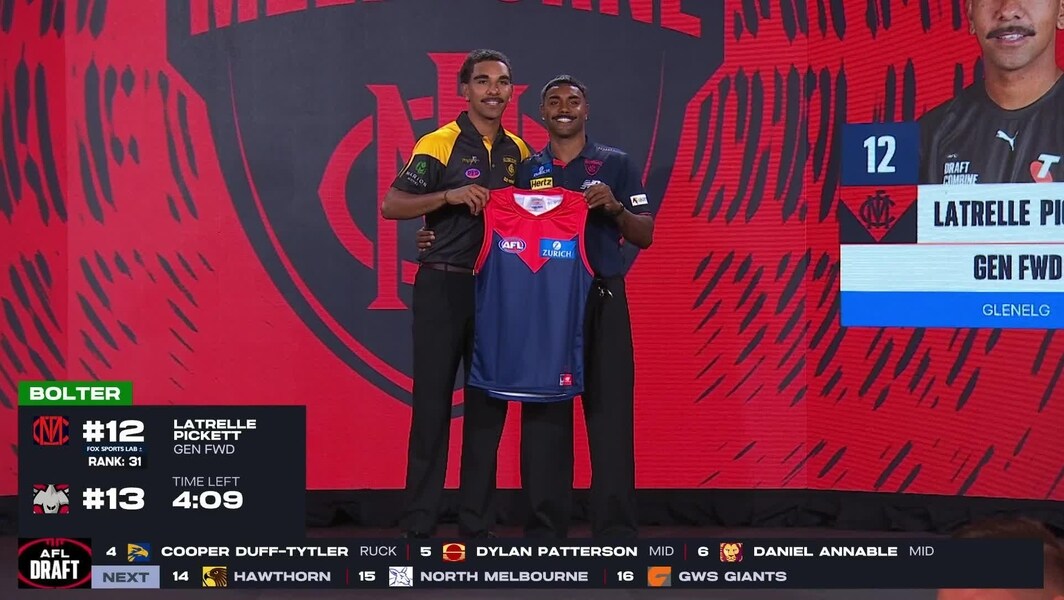 And now Latrelle Pickett, the round one bolter in the Telstra AFL Draft, joins them as an Indigenous player selected at No.12.