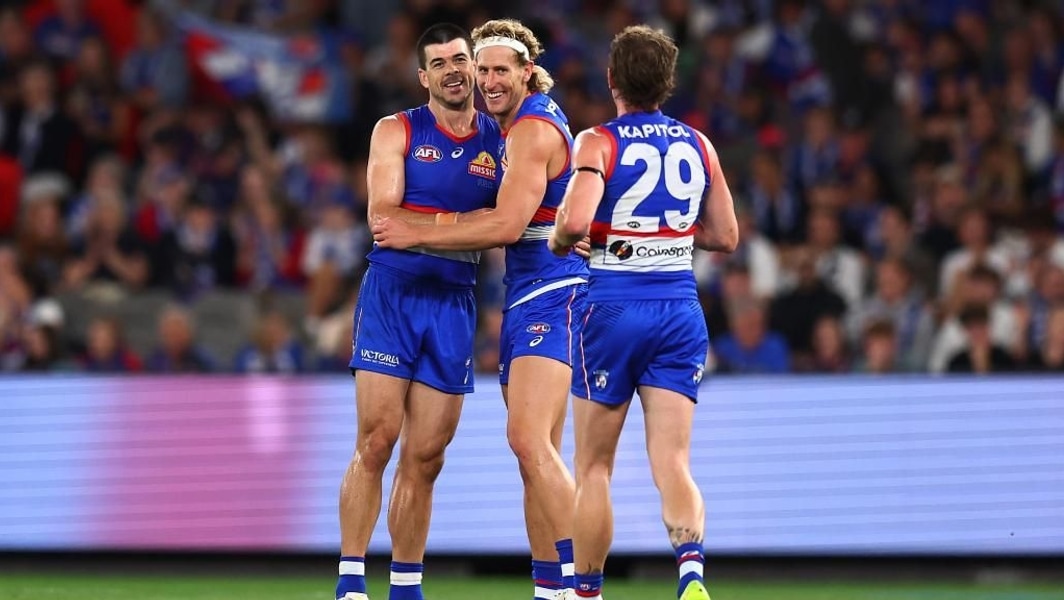 The triple-effort resulted in the ball spilling out to Tim English, who snapped a goal to continue the Dogs’ surge towards victory. But it was the inspired hassling and harrying of Naughton that typified the key forward’s return to career-best form and reflected why his partnership with Sam Darcy is worth so much more than just goals.