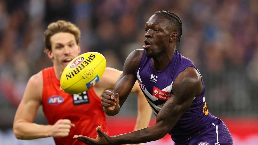 Michael Frederick handballs during Fremantle’s elimination final against Gold Coast on September 6, 2025. Picture: Getty Images
