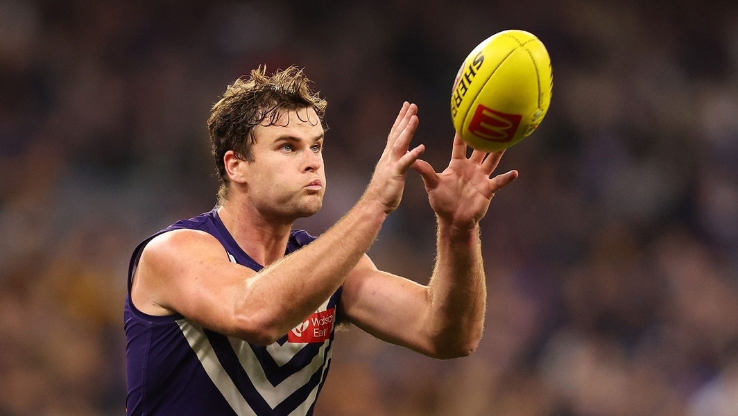 Sean Darcy marks the ball during Fremantle’s clash against Hawthorn in round 18, 2025. Picture: Getty Images