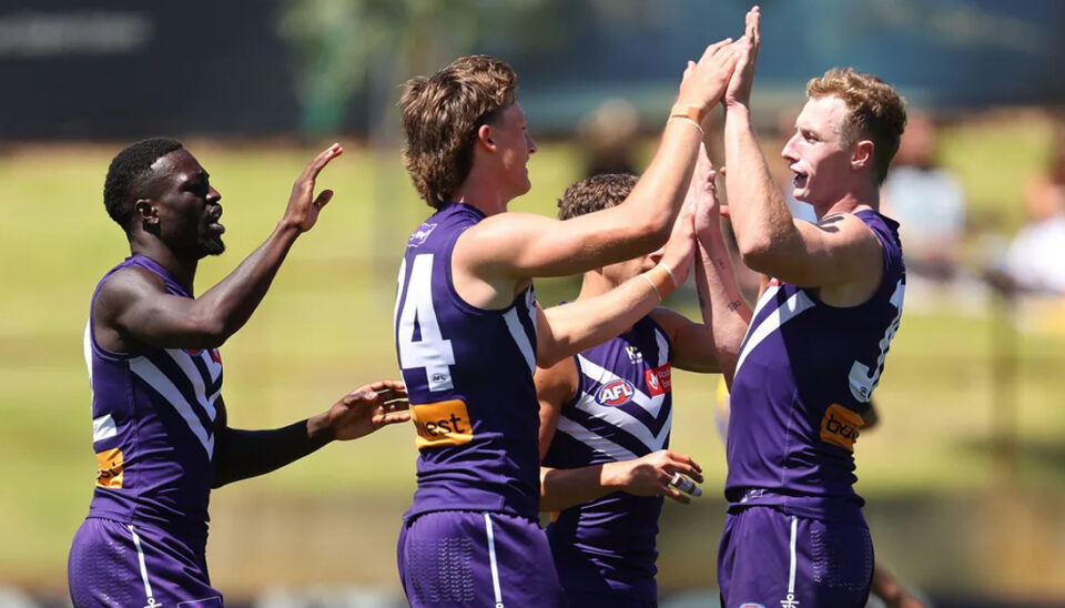 2. Jaeger O’Meara, 3. Caleb Serong, 5. Heath Chapman, 6. Jordan Clark, 8. Andrew Brayshaw, 9. Luke Jackson, 10. Shai Bolton, 11. Tobyn Murray, 16. Murphy Reid, 17. Judd McVee, 18. Mason Cox, 20. Patrick Voss, 21. Oscar McDonald, 23. Karl Worner, 24. Jye Amiss, 25. Alex Pearce, 26. Hayden Young, 28. Neil Erasmus, 30. Nathan O’Driscoll, 31. Brandon Walker, 32. Michael Frederick, 34. Corey Wagner, 35. Josh Treacy, 36. Brennan Cox, 44. Matthew Johnson, 45. Chris Scerri
