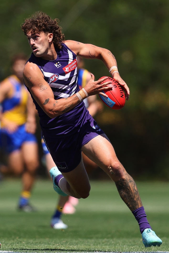 Luke Jackson in action during the Match Simulation between Fremantle and West Coast at Victor George Kailis Oval, on February 21, 2026. Picture: AFL Photos