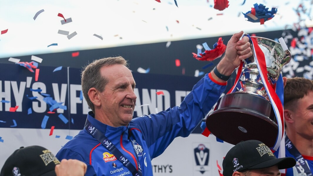 Stewart Edge holds up the VFL premiership cup after Footscray’s win over Southport in 2025. Picture: AFL Photos
