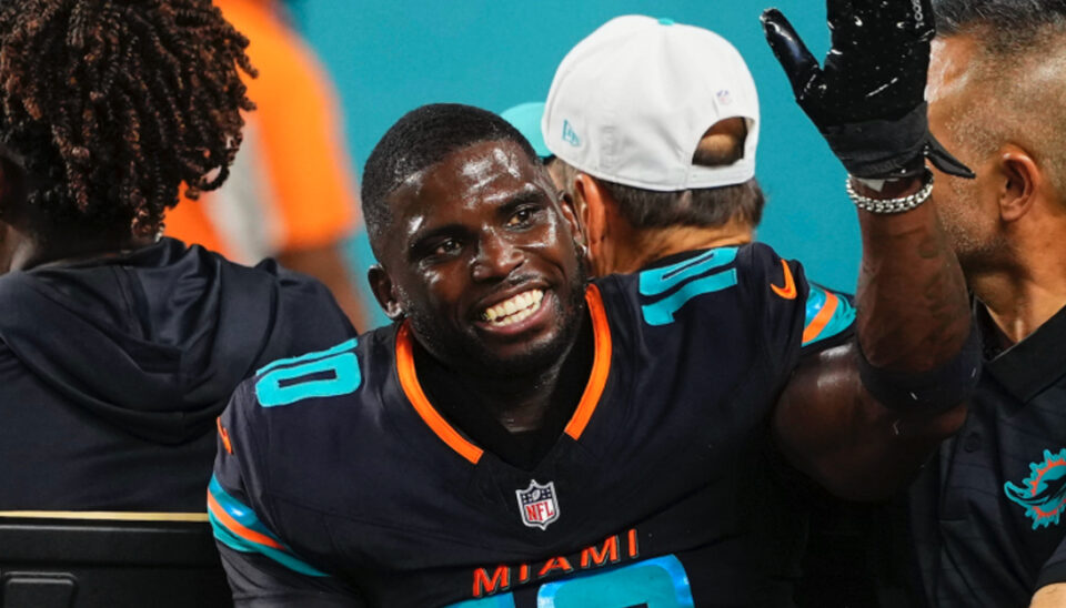 Hill was injured early in the third quarter following a first down reception when his leg bent awkwardly on the turf at the sideline. Footage showed Hill immediately go down in pain and call for assistance. Team medical personnel put an air cast on Hill’s leg, and the former All-Pro waved to the crowd and smiled as he was carted off to the locker room.