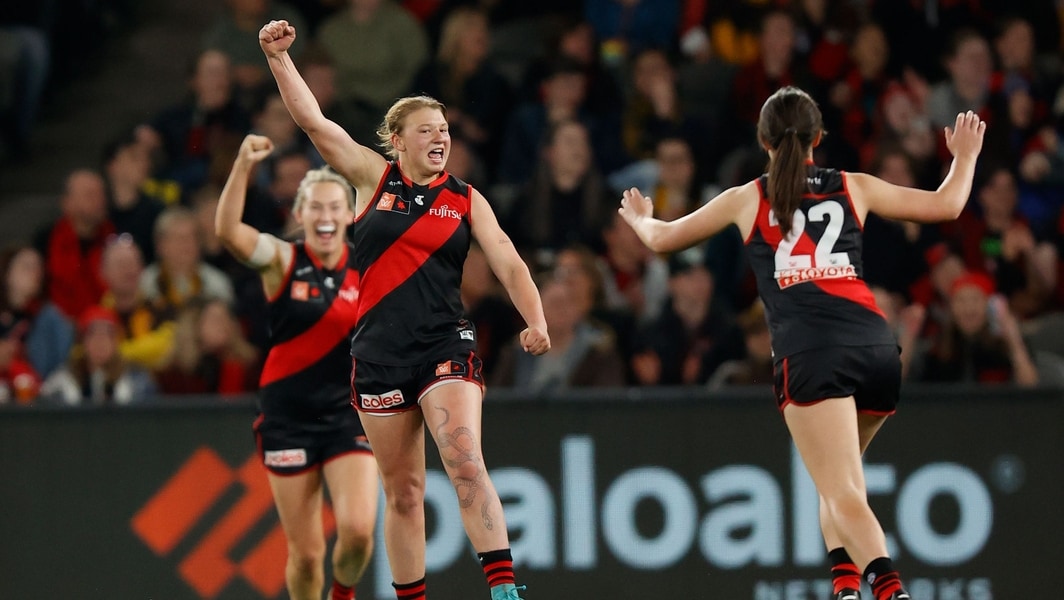 Paige Scott celebrates a goal during the R1 AFLW clash between Essendon and Hawthorn at Marvel Stadium on August 27, 2022. Picture: AFL Photos