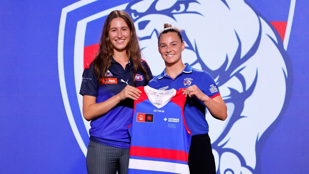 Emma McDonald poses for a photo with Deanna Berry after being drafted by the Western Bulldogs with pick No.8 at the Telstra AFLW Draft on December 16, 2024. Picture: AFL Photos