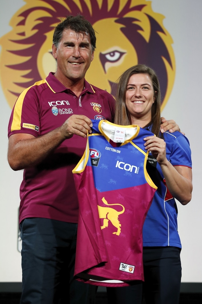 Cathy Svarc with Brisbane coach Craig Starcevich during the 2019 AFLW Draft at the Melbourne Showgrounds on October 22, 2019. Picture: AFL Photos
