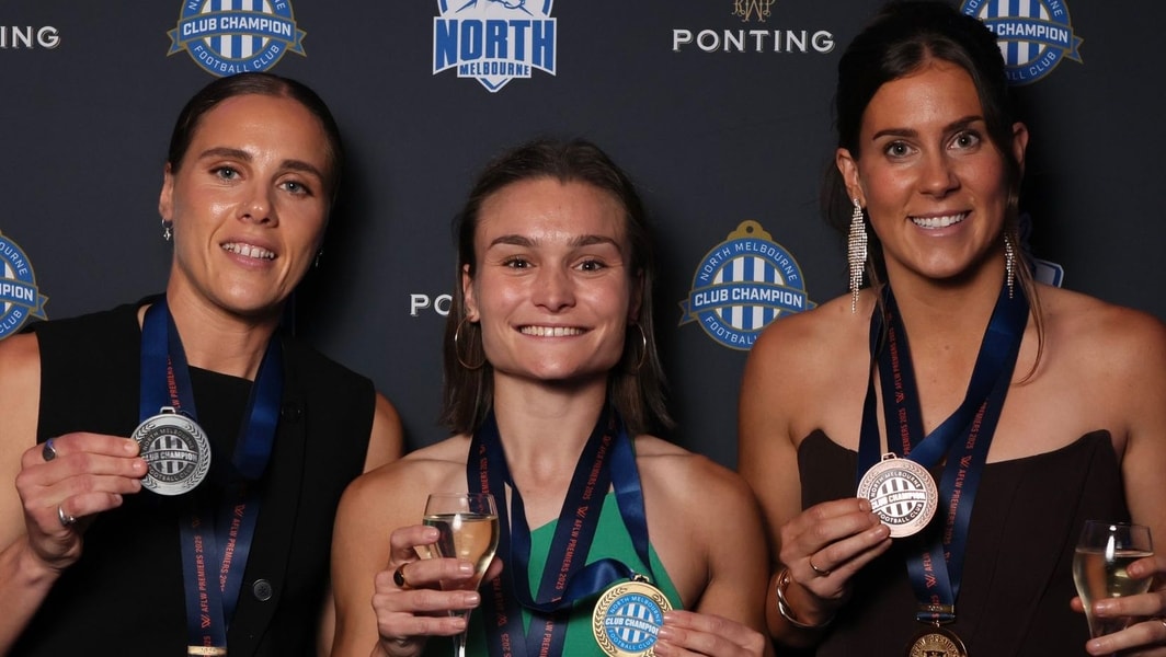 L-R: Jasmine Garner, Ash Riddell and Libby Birch after North Melbourne’s AFLW best and fairest count. Picture: North Melbourne FC