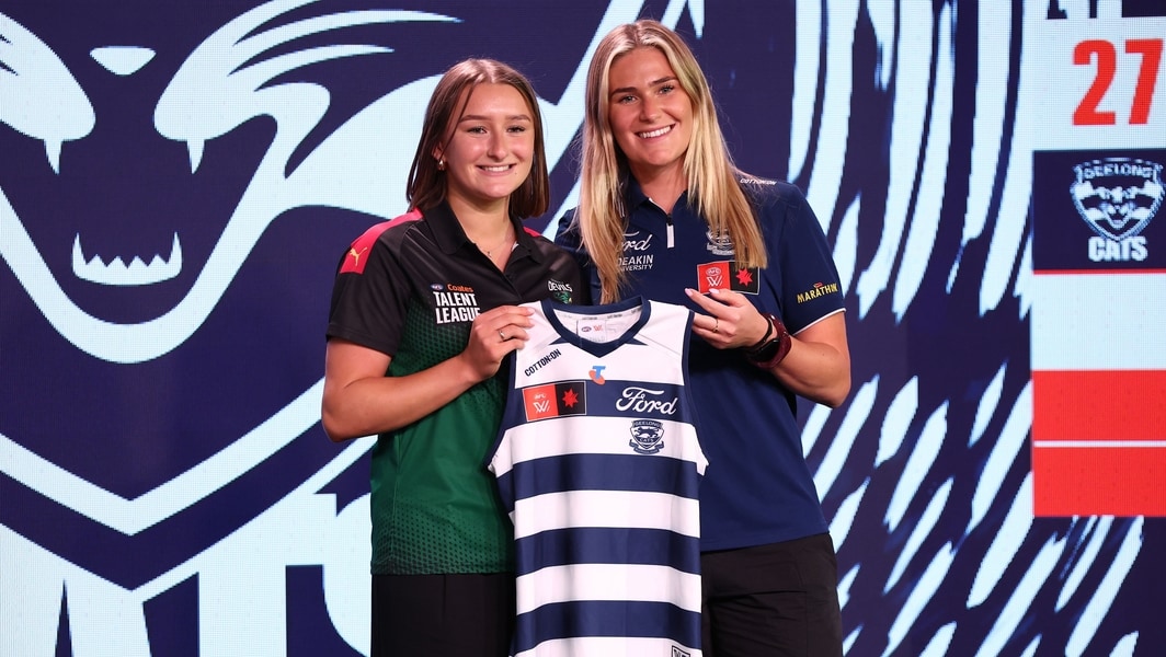 Priya Bowering (Tasmania Devils) poses with Becky Webster after being drafted with pick No.27 by Geelong in the 2025 Telstra AFLW Draft. Picture: AFL Photos