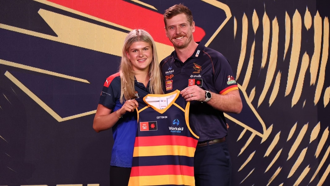 Chloe Bown poses with Ryan Davis after being drafted by Adelaide on December 15, 2025. Picture: AFL Photos