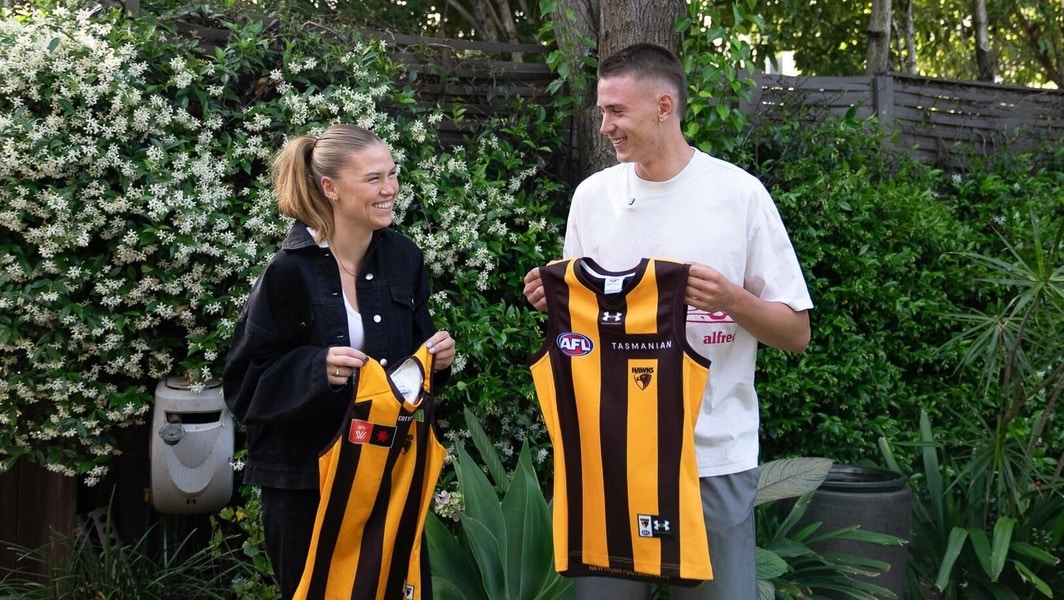 Hawthorn’s Maya and Calsher Dear are pictured with their guernseys. Picture: Hawthorn FC