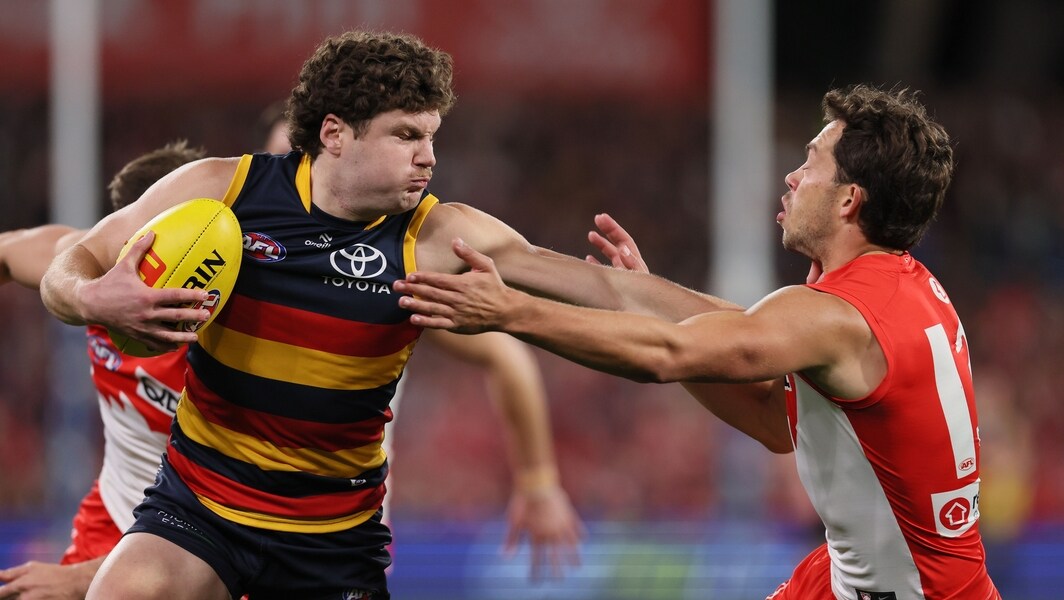 Harry Schoenberg is tackled by Oliver Florent during the match between Adelaide and Sydney at Adelaide Oval in round 14, 2024. Picture: AFL Photos