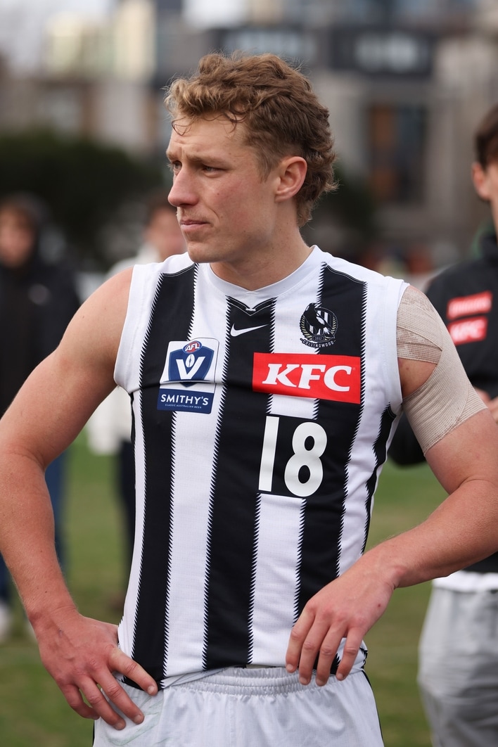 Finlay Macrae at three-quarter time of the match between Port Melbourne and Collingwood at ETU Stadium in round 21, 2025. Picture: AFL Photos