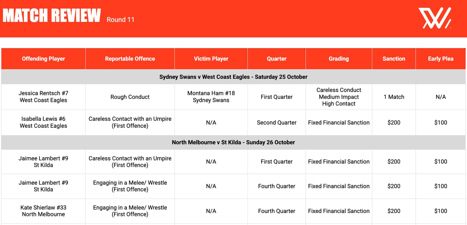 WEST Coast defender Jess Rentsch will miss Friday night’s crucial clash against Carlton after being hit with a one-match suspension for rough conduct against Montana Ham during round 11.