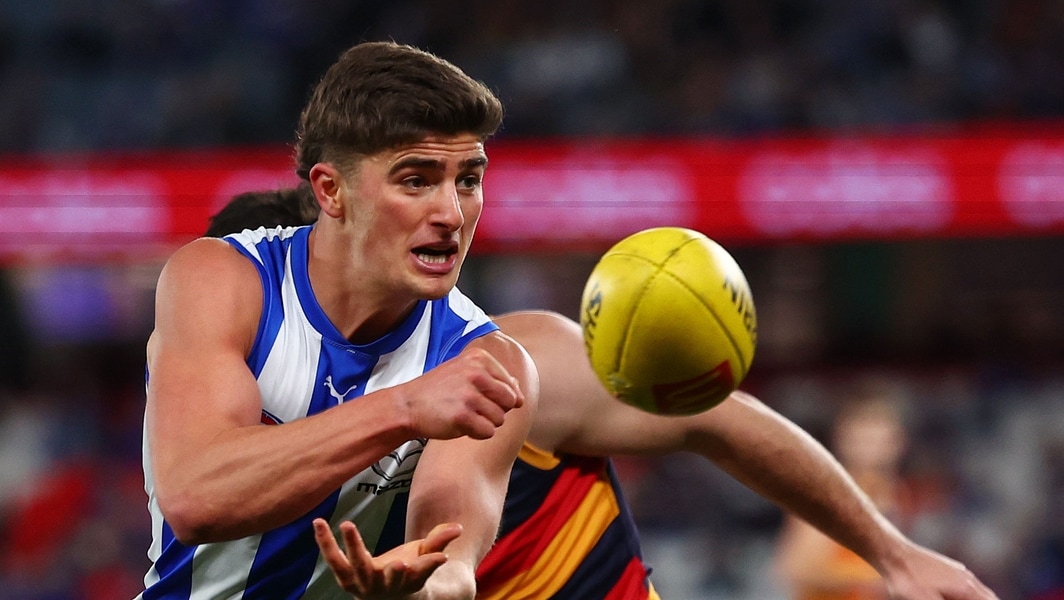 Harry Sheezel handballs during the match between North Melbourne and Adelaide at Marvel Stadium in round 24, 2025. Picture: Getty Images