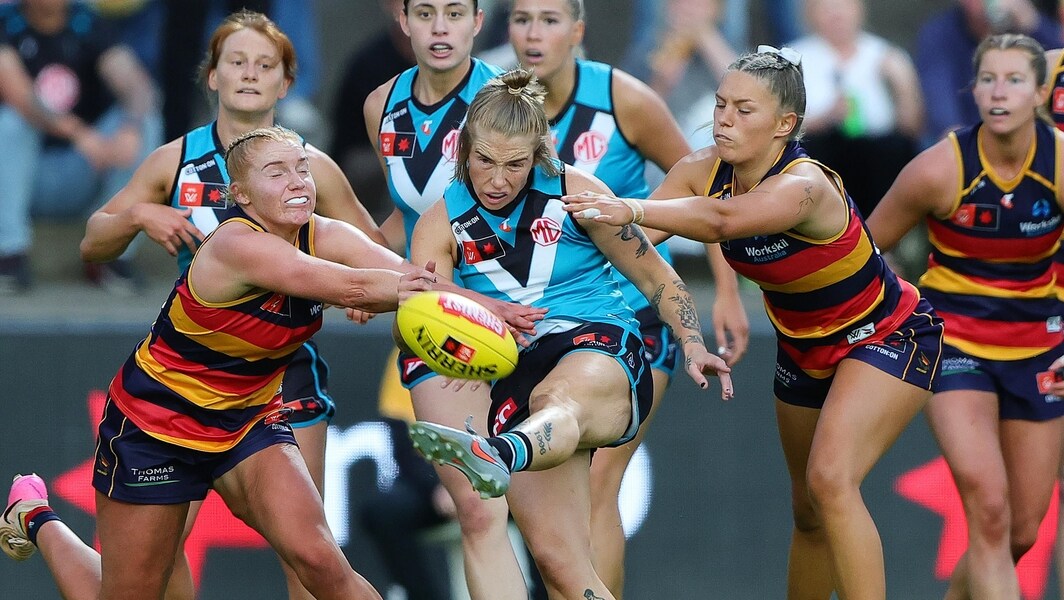 Jasmin Stewart kicks during the AFLW Round 11 match between Adelaide and Port Adelaide at Norwood Oval, October 24, 2025. Picture: AFL Photos