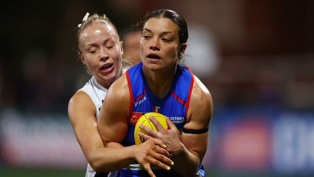 Annie Lee tackles Ellie Blackburn during the match between the Western Bulldogs and Collingwood at Whitten Oval in round seven, 2025. Picture: Getty Images