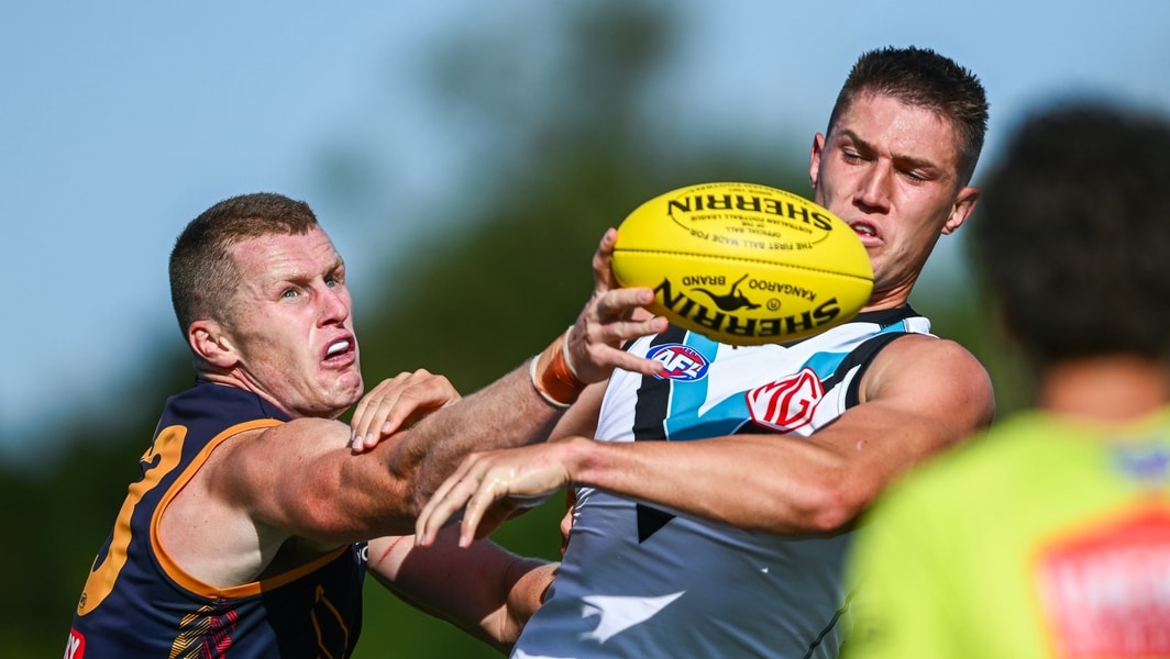 Reilly O’Brien and Jordon Sweet compete during Port Adelaide’s match simulation against Adelaide on February 21, 2025. Picture: AFL Photos