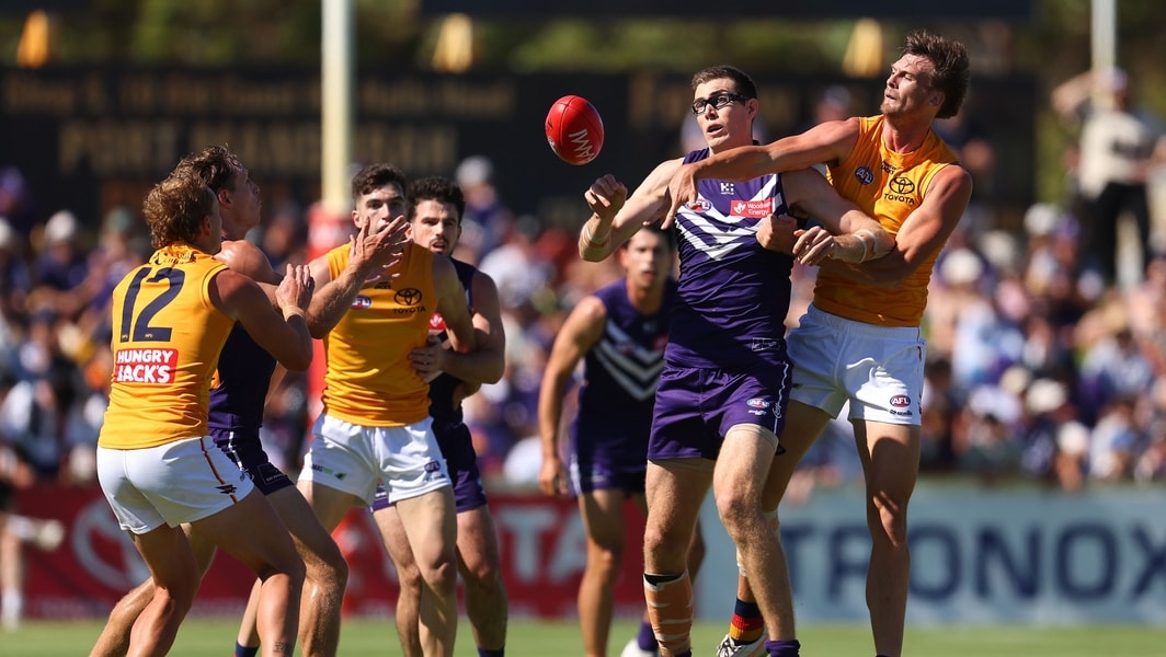 Mason Cox and Lachlan McAndrew contest the ruck during the AAMI Community Series match between Fremantle and Adelaide at Rushton Park on February 28, 2026. Picture: AFL Photos