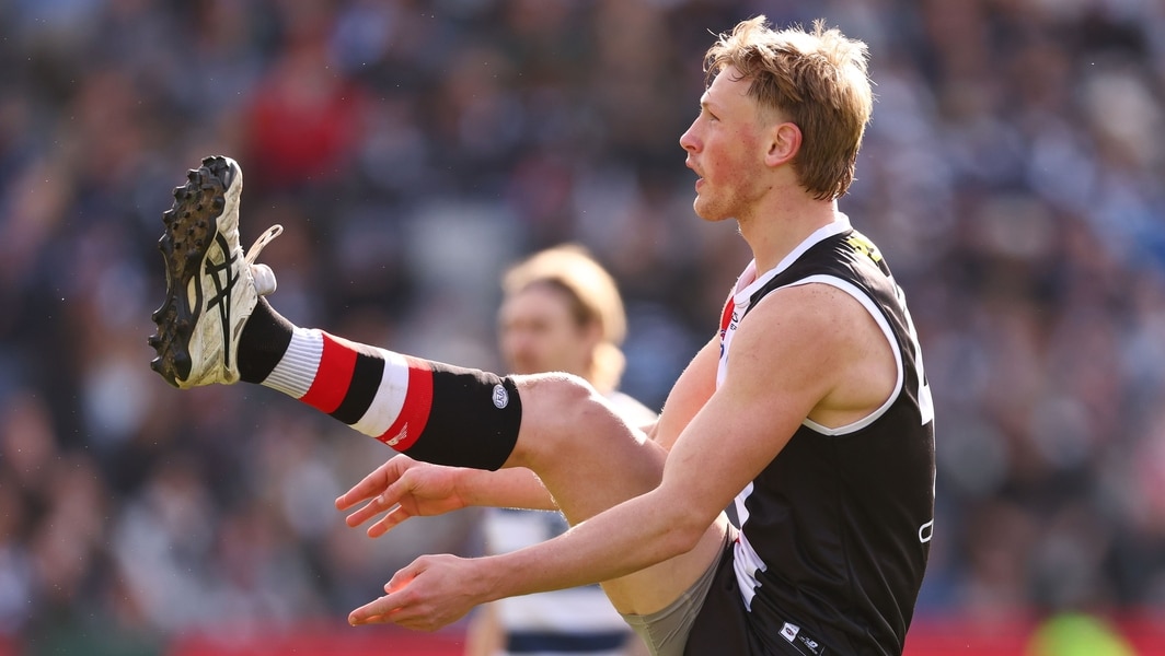 Max Heath kicks the ball during St Kilda’s clash against Geelong in round 19, 2025. Picture: Getty Images