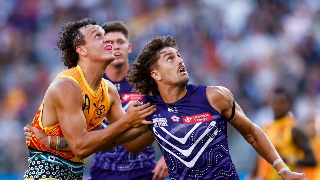 Coen Livingstone and Luke Jackson compete in a ruck contest during the match between the Indigenous All Stars and Fremantle at Optus Stadium on February 15, 2025. Picture: AFL Photos