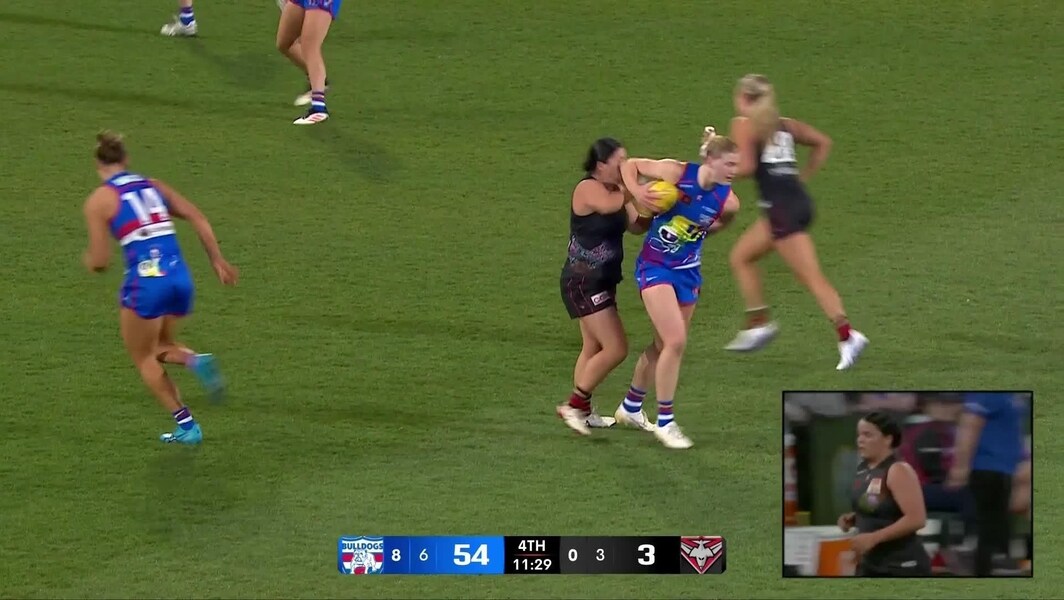 In the only real negative for the Bulldogs, Pritchard may come under the scrutiny of the match review officer after throwing an elbow at Maddy Prespakis in an effort to create space in the final quarter, but clumsily collected the Bomber high, forcing her from the field as blood flowed from her temple.