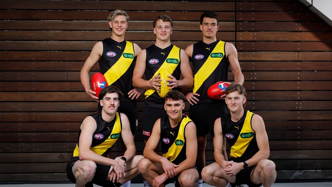 Richmond draftees (back L-R): Josh Smillie, Sam Lalor, Harry Armstrong, and (front L-R) Jonty Faull, Taj Hotton and Luke Trainor at Marvel Stadium on November 21, 2024. Picture: AFL Photos