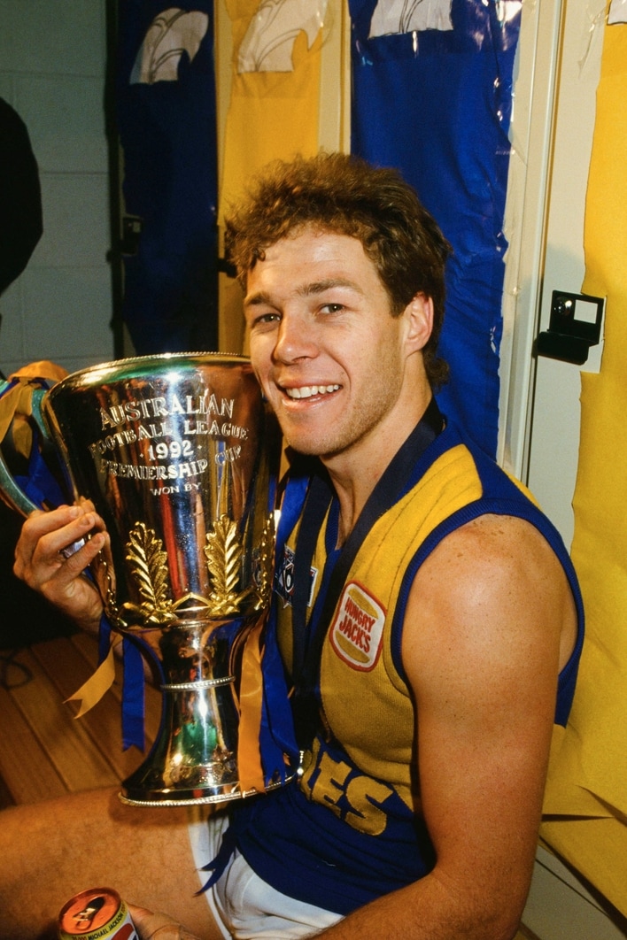 Chris Waterman celebrates West Coast’s 1992 premiership win. Picture: AFL Photos